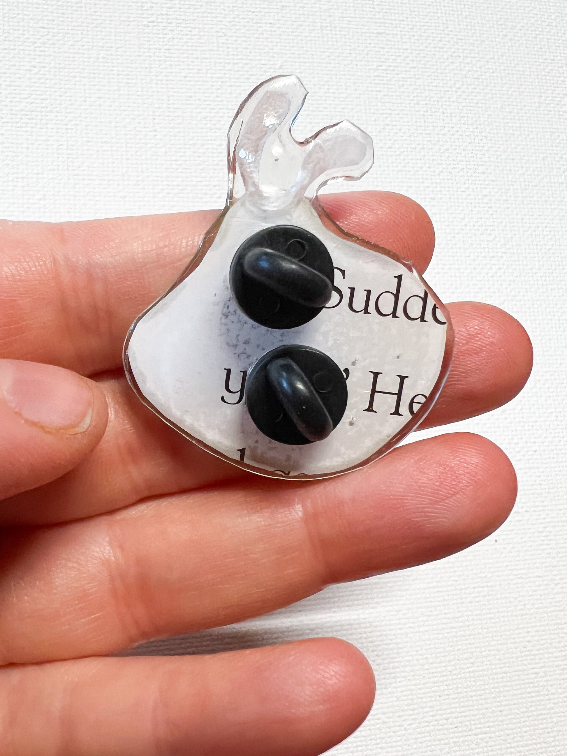 Each pin is handmade in small batches and sealed with UV resin to create a glossy, durable finish. Because the artwork comes from salvaged books, every piece carries its own unique story and charm.